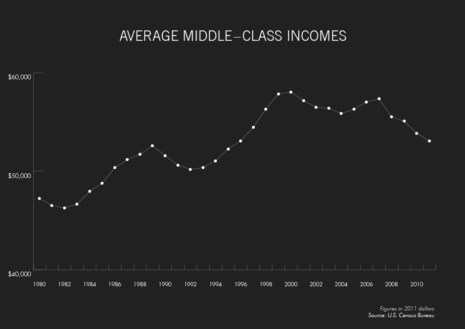 Middle class incomes have shrunk 8.5 percent since 2000, after enjoying mostly steady growth during the previous decade. In 2011, the average income for the middle 60 percent of households stood at $53,042, down from $58,009 at the start of the millennium.