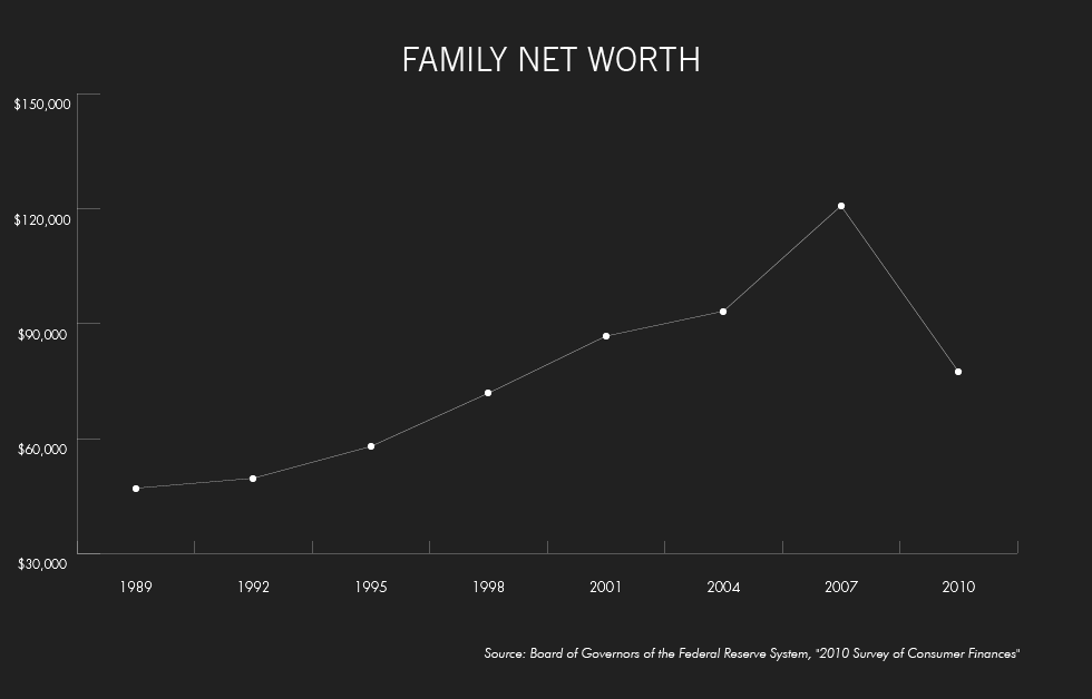 The impact on family net worth — the amount by which assets exceed liabilities — has been painful. In 2007, median net worth peaked at $120, 600. Then came the financial crisis, which pushed millions of Americans into joblessness and home foreclosure. By 2010, net worth had plummeted 36 percent, to $77,300.