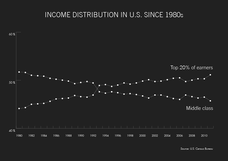 Partly as a result of lower pay, the middle class’s share of the nation’s total income has been falling. In 1980, the middle 60 percent of households accounted for 51.7 of the country’s income. By 2011, they were less than half. Meanwhile, the top fifth of households saw their slice of the national income grow 16 percent, to 51.1 percent from 44.1 percent.