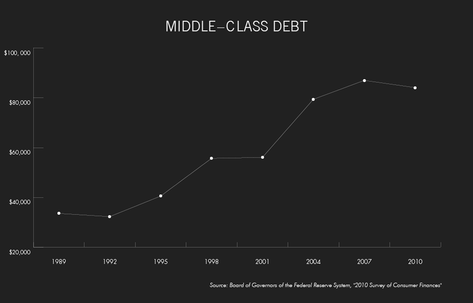 Predictably, the economic pressures facing the middle class have left families deeper in debt. . In 1992, the median level of debt for the middle third of families stood at $32,200. By 2010, that figure had swelled to $84,000, an increase of 161 percent.