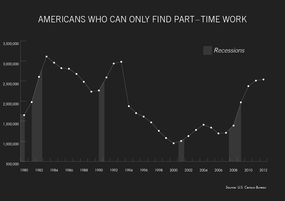 A second factor weighing down pay is the rise in the number of Americans stuck in part-time jobs. In 2012, more than 2.5 million Americans worked part-time jobs because they could not find a full-time position, the most since 1993.
