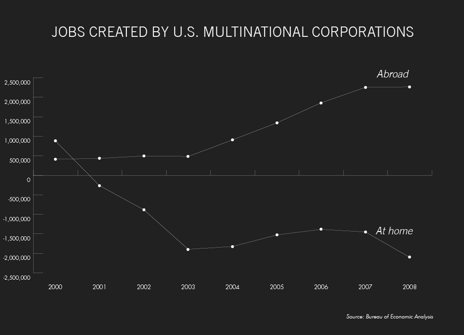 Part of the challenge for job seekers is that U.S. multinational corporations having been hiring less at home. These large, brand-name firms employ roughly a fifth of American workers, but from 1999 to 2008 they shed 2.1 million jobs in the U.S. while adding more than 2.2 million positions abroad.