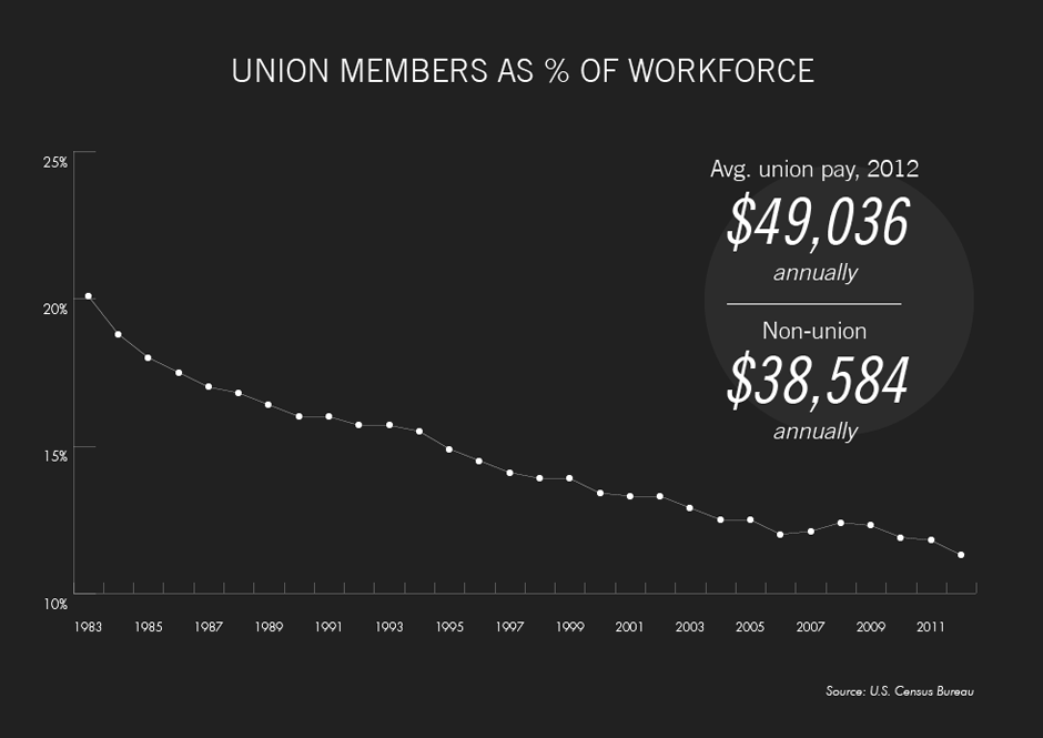 One factor behind the decline in income has been a drop-off in the number of workers earning union salaries. In 2012, the median salary for a unionized worker stood at roughly $49,000. The median pay for their non-union counterparts was just shy of $39,000. Since 1983, however, the share of the population belonging to a labor union has gone from one-in-five workers to just over one-in-ten.