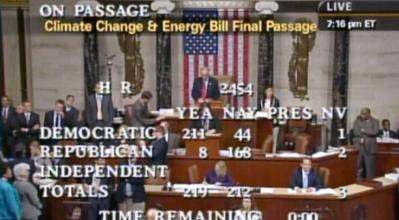 The Waxman-Markey carbon regulation bill, known as the American Clean Energy and Security Act of 2009, passes the House, 219-212. The energy bill is intended to reduce pollution from global warming and to move the U.S. toward a clean-energy economy, in part by setting performance standards for coal-fueled power plants, for example, and providing funding to train workers for jobs in the renewable energy industry. But in July, the Democratic Senate majority leader, Harry Reid, says he won’t bring the legislation forward in the Senate, noting that he wouldn’t be able to pass it. “We know that we don’t have the votes,” he says. The bill’s collapse marks a major setback for the Obama administration’s plans to combat climate change.