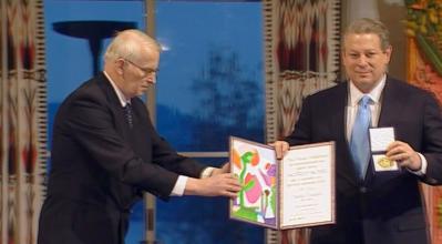 Gore wins the Nobel Peace Prize jointly with the Intergovernmental Panel on Climate Change. In his acceptance speech, Gore speaks of the problem as an urgent danger: