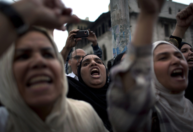 More than 100,000 protest the draft constitution and Morsi’s new powers, chanting “Leave! Leave!” The police fire tear gas, but allow the crowd to surge to the palace walls. The next day, Islamists attack an anti-Morsi sit-in, sparking street battles that leave at least 10 dead.Egyptian protesters chant anti-Muslim Brotherhood slogans during a rally in front of the presidential palace, in Cairo, Egypt, Tuesday, Dec. 4,2012. (AP Photo/Nasser Nasser)