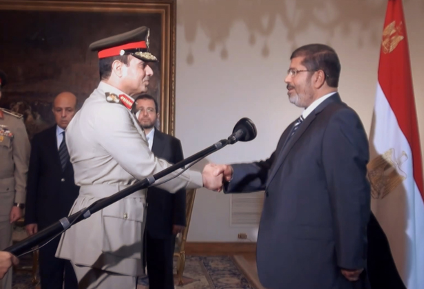 Attempting to reclaim the powers of the presidency, Morsi orders the retirement of the top Mubarak-era military leadership and nullifies the military’s June declaration. He chooses Gen. Abdul Fattah el-Sisi, former head of military intelligence, as his defense minister.Morsi greets Gen. Abdul Fattah el-Sisi, as he appoints him to the post of defense minister. (FRONTLINE)