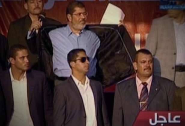 Newly elected President Mohammed Morsi opens his suit jacket to show he’s not wearing body armor, meaning he has no fear. He is sworn in as president on June 30, 2012. (FRONTLINE)