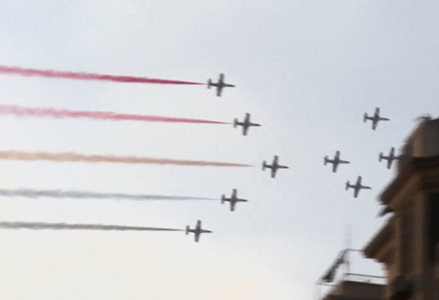 Military planes fly over protesters rallying against Morsi, trailing the colors of the Egyptian flag. (FRONTLINE)
