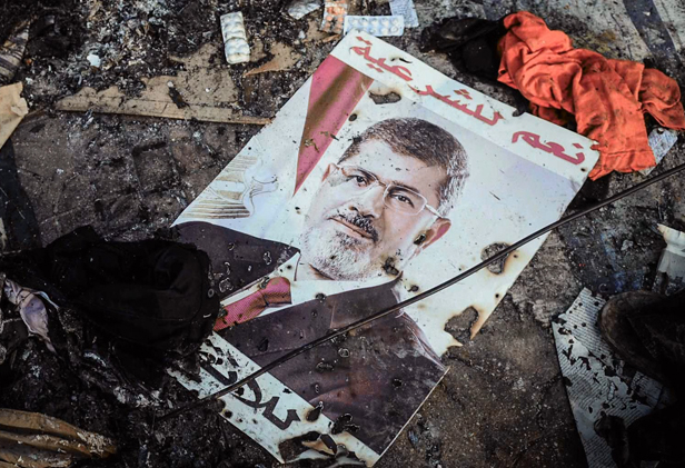 Muslim Brotherhood members and their supporters had been camped out for days in front of the Rabaa mosque in Cairo, protesting the military’s ouster of Morsi. Egyptian military and police had threatened to break up the camps, despite a series of high-level meetings from the U.S. and Europe asking the military to hold off. Sisi had promised a humane dispersal. On Aug. 14, wearing riot gear and driving armored vehicles and bulldozers, the security forces move in, killing at least 600 people and wounding thousands more. The attack, aided by snipers, lasts for more than 12 hours. Following the violence, Mansour, the interim president, announces a return to martial law that existed under Mubarak, and imposes a curfew.A Morsi poster lies amid the charred rubble after the attack at Rabaa mosque. (FRONTLINE)