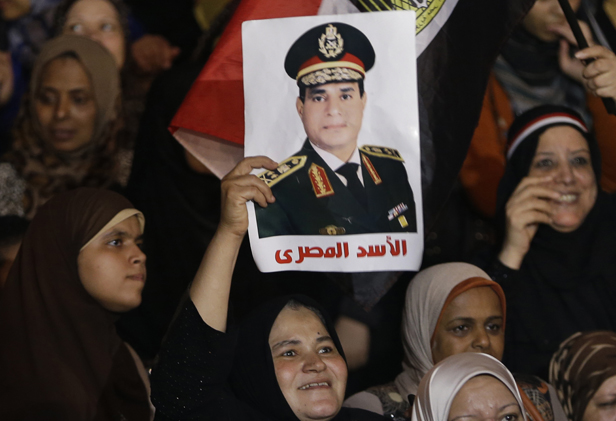 An opponent of ousted President Mohammed Morsi holds up a poster of Egyptian Defense Minister General Abdul Fatah al-Sisi with an Arabic words that read: “The lion of Egypt” during a rally at Tahrir square, in Cairo, Egypt, late Friday, July 19, 2013. (AP Photo/Hussein Malla)