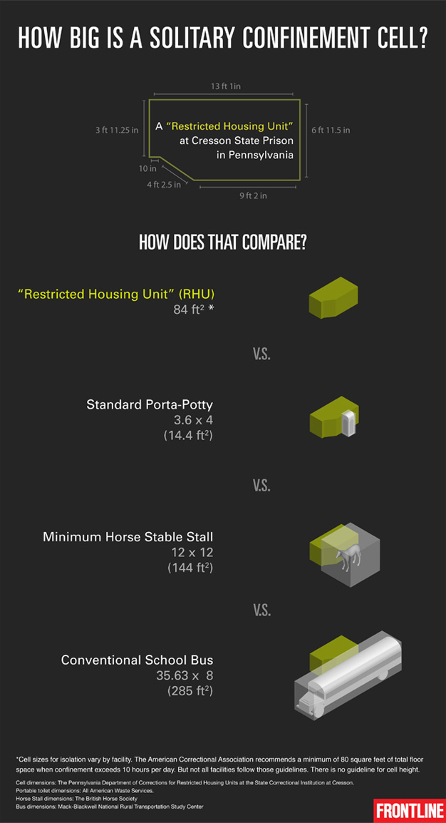 Solitary confinement, or isolation, has different labels depending on the facility and population it targets. It’s sometimes called “administrative segregation,” “special management,” or “restricted” housing. Cell sizes vary: The American Correctional Association recommends that cells have a minimum of 80 square feet of floor space if prisoners are kept there for more than 10 hours per day, but not all facilities follow those guidelines.
