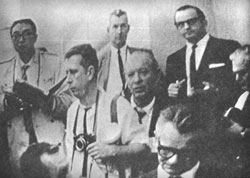 Photo of Jack Ruby (top row,right) with reporters at the back of the press room