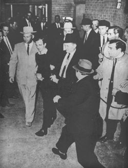 Midnight: Oswald is paraded in front of the press. At the back of the room is one man who is not a policeman or a reporter, a man who carries a gun and has underworld connections. His name is Jacob Rubenstein, known as Jack Ruby. In less than 36 hours, he will murder Lee Harvey Oswald.