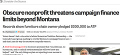 “Voters haven’t had a clue who is behind American Tradition Partnership,” writes Paul Abowd for the Center for Public Integrity. “And that’s just the way the secretive nonprofit wants it.” Formerly known as Western Tradition Partnership, the group has been pushing to strike down many of Montana’s strict campaign finance laws. In this investigation, CPI identifies the man who ATP’s records indicate is the organization’s founding donor — Jake Jabs, the owner of Colorado’s largest furniture chain — and uncovers affiliations with national tea party groups funded by the conservative billionaire Koch brothers. Jabs denies ever hearing of the group, telling FRONTLINE, “I think they just grabbed my name out of a hat to forward their agenda.”