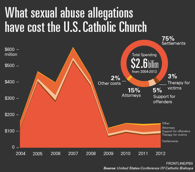 When Doyle and his colleagues wrote their manual in 1985, they warned that abuse allegations could cost the Catholic Church $1 billion over 10 years if it failed to act. By 2012, nearly two decades later, it had spent more than $2.6 billion in civil suits in the U.S. alone, including therapy costs for victims and the price of defending the alleged abusers, according to the Conference.