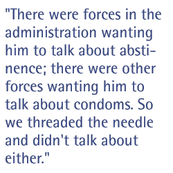 I think he was from another era, and to my knowledge, I don't remember him ever saying the word "condom" in a speech. That was just not him. "Abstinence" was actually a word that we didn't use in the AIDS speech, because if I had put in the speech the story that I just told you about abstinence, the media would have made fun of him. The audience wouldn't have [accepted] them except in a negative way. But there were forces in the administration wanting him to talk about abstinence; there were other forces wanting him to talk about condoms. So we threaded the needle and didn't talk about either.