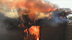 A Darfurian hut burns during an attack.