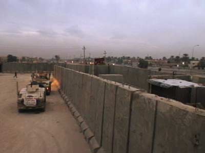 "What was that?" says a soldier. A minute later. A louder explosion. With a camera I walk over to the nearest guard tower where I hope to get a view of the neighborhood to see what's happening outside the walls. The guard, who is protected by sandbags up to his neck, points in the direction of a mosque down the street. "Boom. Boom," he says, but I can't see anything. I take a few shots of the streets. I wonder if I'm looking at route Johnny Walker Red or Johnny Walker Black and climb back down.