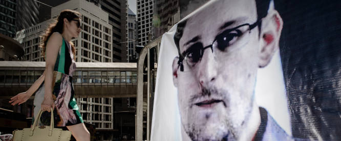 A woman walks past a banner displayed in support of former US spy Edward Snowden in Hong Kong on June 18, 2013. (Philippe Lopez/AFP/Getty Images)