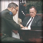 Powell: It was eight o'clock in the morning when we assembled. The President had to leave shortly after the meeting began to go out to Aspen, Colorado to meet with Prime Minister Thatcher and also to give a speech announcing the new re-structuring of the armed forces of the United States that I worked on so hard, as had all of my colleages in the administration. And you have to remember the invasion was only about twelve hours old. Invasions don't come full blown and you know exactly what your enemy is doing and how many forces he's pulling, putting in and what his political objective is.