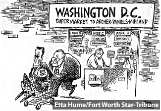 Meanwhile, Dole has become known to some as "Senator Ethanol" because of his longtime, staunch support of federal tax subsidies for corn-based ethanol, a gasoline additive. A.D.M., which produces sixty percent of all U.S. ethanol, has been a major beneficiary. Congressional fans of ethanol, many of them, like Dole, representatives of corn states, say it has helped ease US dependence on foreign oil. Others are not convinced. Recently New Jersey Senator Bill Bradley told The Boston Globe, "This billion-dollar tax break is nothing more than a gift to a single, politically connected industry." Andreas' critics link federal subsidies -- including sugar price supports and the ethanol tax break -- to the influence that they say his political dollars have bought him among elected officials. The sugar subsidy has the effect of raising the price of a corn syrup sweetner, another important A.D.M. product. In his stock reply to such charges, Andreas says, "We do not talk to any government official about our business."