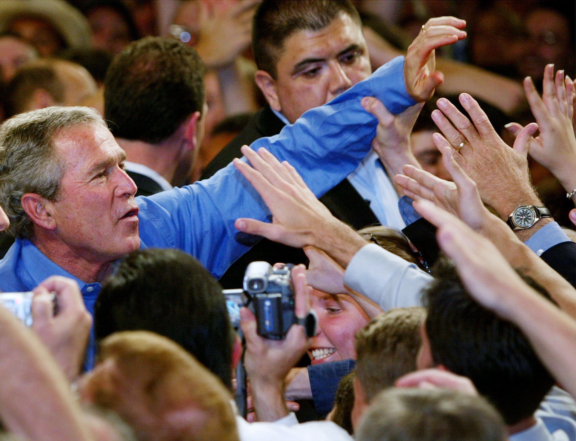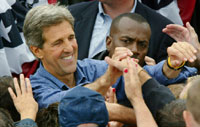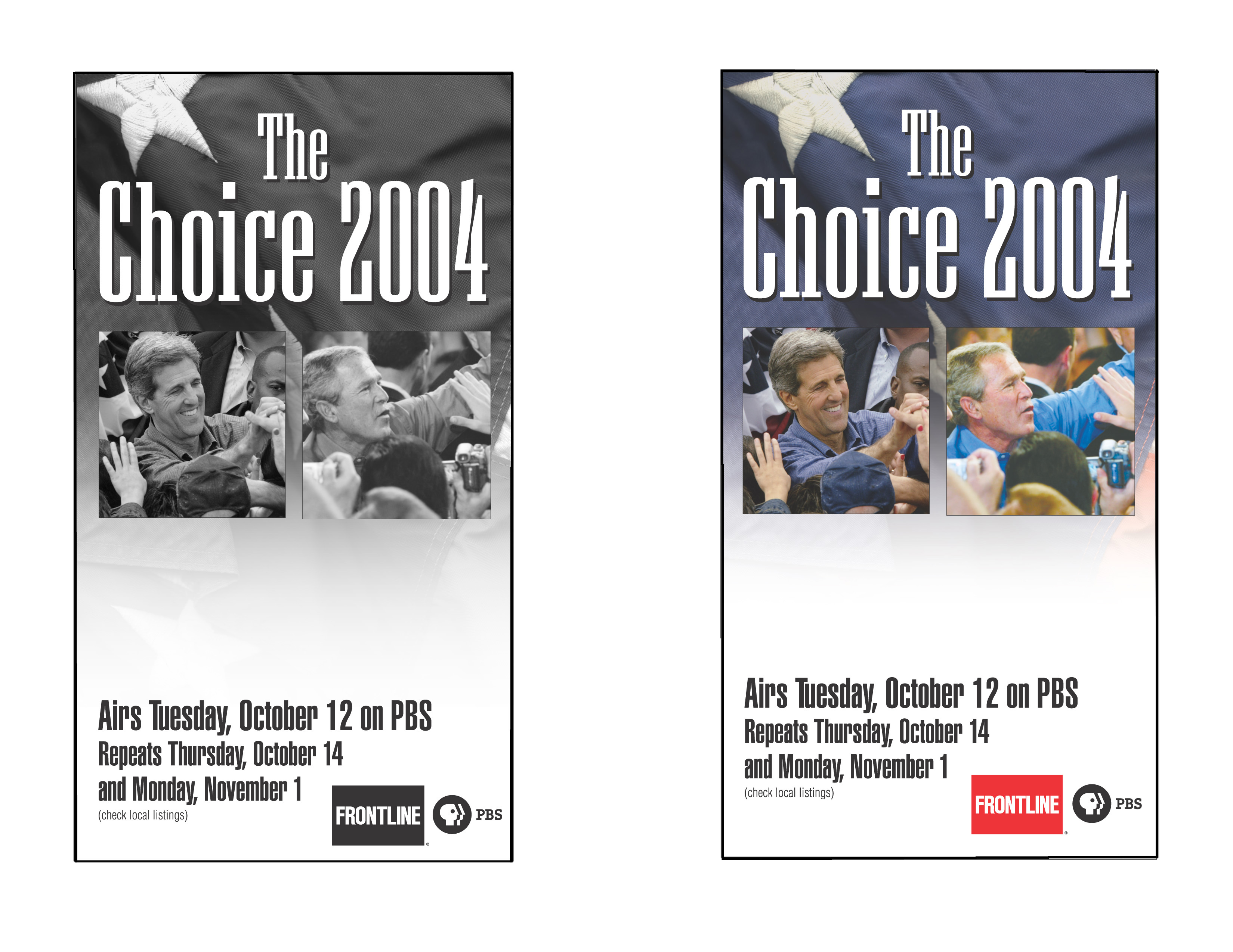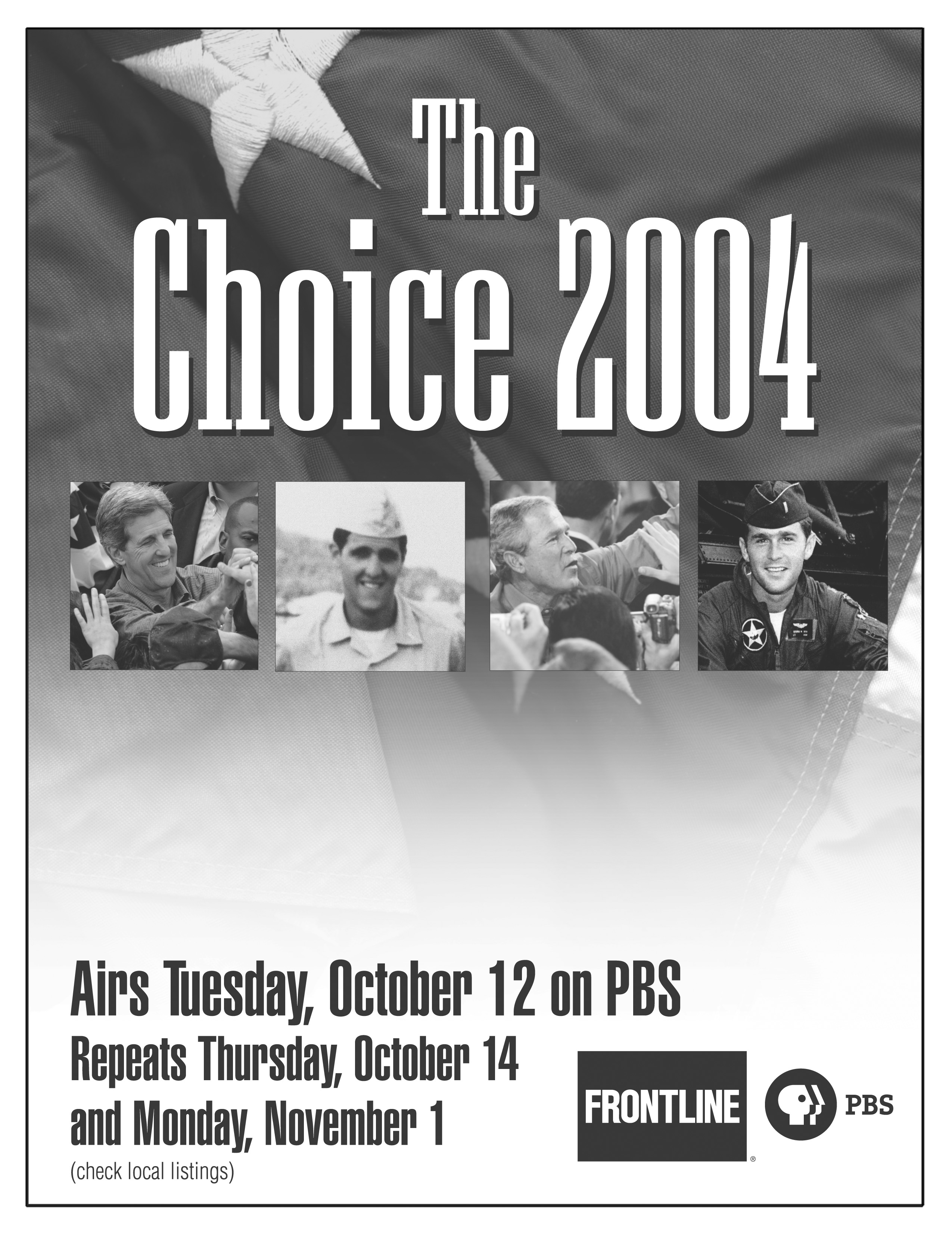 "The Choice 2004" airs nationally three times before the election, on PBS: Tuesday, October 12, Thursday, October 14, and Monday, November 1, at 9 P.M. (check your local listings for exact dates and times). We encourage you to host a screening around one of these airdates. Another option would be to screen an excerpt clip followed by a panel discussion. Panelists from your campus could include political science professors, political club representatives, etc. If you'd like to receive a clip, contact Jenna. For some helpful tips to plan a screening event on your campus, and a brief description of the film, click here. For a campus newspaper ad and a flier template, click here. Should you decide to make your own ad/flier using the photos provided, please be sure to also include the FRONTLINE and PBS logos.