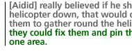 I talked to Aidid at length personally about the day of the battle in Mogadishu and the tactics involved. I was [an] interviewer, [and] I was interested [in hearing] from his side. I was on the ground and had talked to General Garrison and his forces about what had happened, and of course we were about getting the prisoners out, but I took the opportunity to ask Aidid what had happened that day and how he had organized himself for this. He said, "We had watched those men at the airfield," -- he called them "those dangerous men at the airfield" -- and how they operated and he made the determination that the helicopters were the vulnerability, or the center of gravity, and so when they held a meeting he put people on the roofs of the houses around the meeting place with the machine guns and rocket launchers and they were to concentrate all their fire on the helicopters. He really believed if he shot a helicopter down, that would cause them to gather round the helicopters, they could fix them and pin them in one area. The reaction force, he said, always came out of the airfield -- in our day in UNITAF we had a number of reaction forces come from different ways, but he said unlike those days the reaction force always came out of the airfield -- "so we watched where the reaction forces came from [and] we put in an ambush, and it was only activated when we held meetings, so it would engage the reaction force or slow it down or stop it," which I think happened that day. He had designed a set of tactics that ended up working, unfortunately. Though I think that operation would have been a success and the Rangers would have been out of there had the helicopter not been hit right toward the end; it would have been a tremendously quick in-and-out operation. [I think it was a combination of a] little bit of bad luck in [Aidid's] favor, and what I think might have been some pretty astute tactical decisions by General Aidid and his militia.