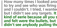 It's just loud cracking, and by your ears you hear the pings and the cracks. I'd never heard that before; you always hear gunfire but you don't actually hear the crack of a round zipping by you. It's not a good feeling, especially with those being rounds going by. I was getting worried, there's a lot of fire; sooner or later one of them's actually gonna hit me, you can't be that lucky for that long. Once we got moving, it was a little bit better because you're not thinking about it, but when you're sitting still and you're waiting to go and rounds are cracking by you, you start getting nervous, you start getting scared, it's like, "OK, we need to move, we need to go, we need to do something." Or, "I need to do something." To try and get your mind off of it. Yeah, it's not a good feeling. I didn't like that at all. You feel vulnerable, especially when you don't know where it's coming from. How many times I looked around to try and see who was firing at me and I couldn't. I tried, I wanted to, but I didn't see any targets. It was kind of eerie because all you saw and felt were the bullets, but you didn't see anybody pulling the trigger.