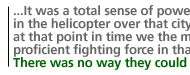 Run down... very poor. The first time I flew over, we went to a height of four or five thousand feet and our first flight was like a statement -- 'Here we are. And here's the deal,' you know? At times the birds would start doing evasion patterns while flying over the city. The first time we flew over, the people just stopped because that was the largest helicopter force that had been in country... And whenever they do a banking turn... they would pull these real tight turns. It was almost like you've stopped and you're just getting twisted... the bird would shake and you're looking straight down at a road intersection and these people are just looking at you. You just know that it's fear. And I'm a nice guy, but that was a feeling of power. I don't like to come across like that, but I tell you what it was like -- all business.