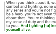 Kinda seeped out [at] weird times. Driving up the road to Atlanta or something. And you hear a song on the radio that doesn't even have anything to do with that... some lyric or something, and all of a sudden my eyes just start welling up. When you think about it, war and combat and fighting, none of it makes any sense. There's really no purpose to it, and you fight it because you have a sense of duty. And when it comes down to it that's what you're fighting for. You're not fighting to be a hero, you're not even thinking about that. You're thinking about my sense of duty, and the man next to you, and fighting [to] keep yourself alive.