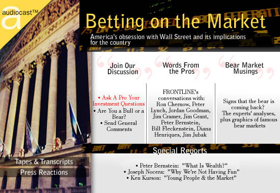 audiocast | join our discussion | words from the pros | bear market musings | peter bernstein: what is wealth | joseph nocera: why we're not having fun | ken kurson: young people & the market | tapes & transcripts | press reactions | explore FRONTLINE | pbs online | wgbh