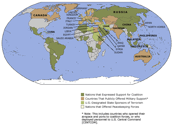 The U.S. State Department began assembling a global coalition of nations to fight terrorism on Sept. 12, 2001. Nations throughout the world have provided not only military assistance, but also assistance on the political, diplomatic, economic, law enforcement and intelligence fronts. This map shows some of the countries that are contributing to the coalition and some of the ways in which they have helped. Click on a country's name to read more details on its contributions.