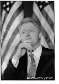 clinton with buddy (4.29.1998)CHAPTER VI:  1999-2000 THE POST-IMPEACHMENT PRESIDENCY: Following the Senate acquittal, the president was able to reenergize his domestic agenda and to focus more intensely on foreign affairs.  Clinton also had to prepare himself for another difficult transition.  Instead of being the man in the spotlight, Clinton would now have a supporting role as fundraiser and campaigner for his wife and his vice president. This chapter concludes with analyses of what may ultimately be the Clinton legacy.