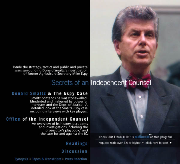 In a rare in-depth television interview given by a sitting independent counsel, Donald Smaltz takes FRONTLINE inside his investigation of former Agriculture Secretary Mike Espy. FRONTLINE correspondent Peter Boyer steps behind the current controversy about Kenneth Starr to find out what these independent counsels really want, how far they'll go to get it, and why they cost so much money.