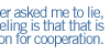 They have never asked me to lie, but my gut feeling is that that is the only definition for cooperation. I spent the time with them. I gave them documents they asked for. Went to the expense to have bank records that they already had and everything redone, and resent to them and they would continue to ask for more and more documentation, and then say they didn't have it. We would continue to provide. My understanding of the definition of cooperating is that I have done all that. I don't know what they could mean beyond what I have already done.