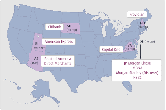 This map shows the top ten credit card issuers, their state of charter (except for AmEx and Capital One that are not nationally chartered), and the maximum interest percentage cap for credit cards.