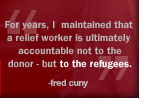 This is an engrossing analysis by Cuny of what's wrong with international relief efforts. It is an edited version of a memorandum he wrote in July1994 to former Representative Steve Solarz (D-NY). Cuny was answering questions Solarz had asked about the problems with the existing system and the ways in which they might be solved through the creation of the International Crisis Group (ICG). ICG is a world-wide crisis-intervention organization Fred was trying to start with others at the time.