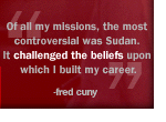 The story of Fred Cuny has moved and inspired me in a most profound way. My humanity is confirmed ever so more after hearing the story of his life. Life is made more bearable knowing that there are people on this planet with the courage to act selflessly in the face of danger, who have the compassion to face the suffering that would be unbearable for most of us face, and who have the strength and resolve to do all they can for their convictions. Fred Cuny was a true hero, belonging in the ranks of people such as Raoul Wallenberg, Harriet Tubman, and Mother Teresa .