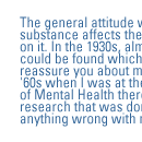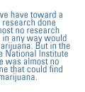 And, I've always thought that it reveals how much the general attitude we have toward a substance affects [and] the research that is done on it. Because in the 1930s, almost no research could be found which in any way would reassure you about marijuana. But in the 1960s, when I was at the National Institute of Mental Health, there was almost no research that was done that could find anything wrong with marijuana.