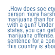 Well, again, I think that the sentences for marijuana crimes are disproportionate to the actual harms that are being caused by the drug. The most widely abused and most deadly drugs in the United States unquestionably are alcohol and tobacco and if you were to turn on MTV you can see beer ads. Essentially eighth graders drink alcohol three times more often than they smoke pot and the difference between how we treat alcohol and how we treat marijuana is completely a culturally and not a logically based policy.