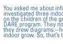 People get hurt, not physically, but families get hurt. It happens, but that's very fair and simple. If you're in there, in your house, growing marijuana for your own use, chances are we will probably never show up, because you're not going to use that much power. Nothing, people are not going to know about it. You asked me about informants. One year, we did three indoor grows here based on the children [of] the growers, through the D.A.R.E. program. They not only told us about it. They drew diagrams. How to get to daddy's indoor grow. So, that's tough on a family.