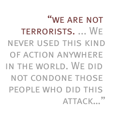 In short, we are not terrorists. ... We never used this kind of action anywhere in the world. We did not condone those people who did this attack here in New York and in Washington. And also our president tell American government to be wise enough to use their mind, their wisdom, and not to just to use their force, because you will never succeed only with force. You have to use your wisdom. You have to be wise enough to confront the reality, of what is going on.