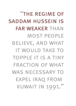 I think the regime of Saddam Hussein is far weaker than most people believe, and what it would take to topple it is a tiny fraction of what was necessary to expel Iraq from Kuwait in 1991.