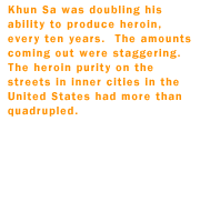 Ferrarone: ....Khun Sa was doubling his capacity, his ability to produce heroin, every ten years. The amounts that were coming out were staggering. The heroin purity on the streets in inner cities in the United States had more than quadrupled. Some places were going from six and ten and a half purity that an addict received in a dosage unit on the street... Now we were looking at sixty to eighty to ninety percent pure heroin on the street. And so the problem certainly over the last twenty years did not lessen. It went in the exact opposite direction. It was a disaster. And you could, by looking at Khun Sa's capacity, understand that he was not having a cash flow problem.