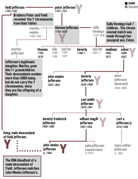 mapping jefferson's y chromosome: Only males carry the Y chromosome.  Certain features of the chromosome are passed from father to son without much change over generations.
