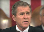 In his State of the Union address, Bush describes North Korea as "a regime arming with missiles and weapons of mass destruction, while starving its citizens." He warns that states seeking weapons of mass destruction are a "grave and growing danger" to U.S. security and signals that the U.S. will act preemptively to deal with such nations. In a memorable turn of phrase, Bush labels Iraq, Iran and North Korea an "axis of evil."