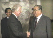 Despite opposition from some senior members of the Clinton administration, former U.S. president Jimmy Carter travels on a private trip to Pyongyang to meet with Kim Il Sung and try to broker a diplomatic solution to the crisis. While in Pyongyang, Carter makes a controversial television appearance in which he details the commitments he has extracted from Kim Il Sung. He tells CNN that Kim Il Sung "[has] given me assurance that as long as this good-faith effort is going on between the United States and North Korea, that the inspectors will stay on site and the surveillance equipment will not be interrupted." Carter also announces that Kim Il Sung has agreed to go back to the negotiating table.