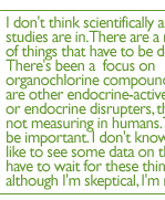 SS: Well, the difference is, I don't think scientifically all the studies are in. I think there are a number of things that have to be done. There's been a lot of focus on organochlorine compounds. There are other endocrine-active chemicals, or endocrine disrupters, that we're not measuring in humans. They could be important. I don't know. And I think I'd like to see some data on that. So, we have to wait for these things. So, although I'm skeptical, I'm not dismissive.