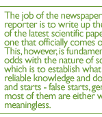 But if science writers can't afford too much skepticism for fear of losing their jobs, readers, at least, can afford to be skeptical-and should be. As for me, I try to get through the morning papers by reminding myself of an old saying about the press. It goes something like this: "Trying to tell what's going on in the world by reading the daily newspapers is like trying to tell what time it is by looking at the second hand of a clock."